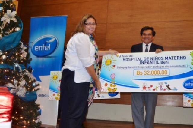 En acto público, el gerente general de ENTEL, Oscar Coca, hizo la entrega simbólica de cheques, al director del hospital del Niño de La Paz, Dr. Joseph Henao y a los gerentes regionales de ENTEL para los 8 departamentos quienes a su turno harán la entrega correspondiente en sus regiones.