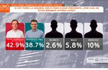 Encuesta Red Uno: Tuto lidera con el 42,9% de la intención de voto, Paz alcanza el 38,7%Octubre 10 La diferencia entre ambos candidatos es del 4,2%.; sin embargo, hay un 18,4% de gente que, por ahora, se inclina a no apoyar a ningún postulante o... |