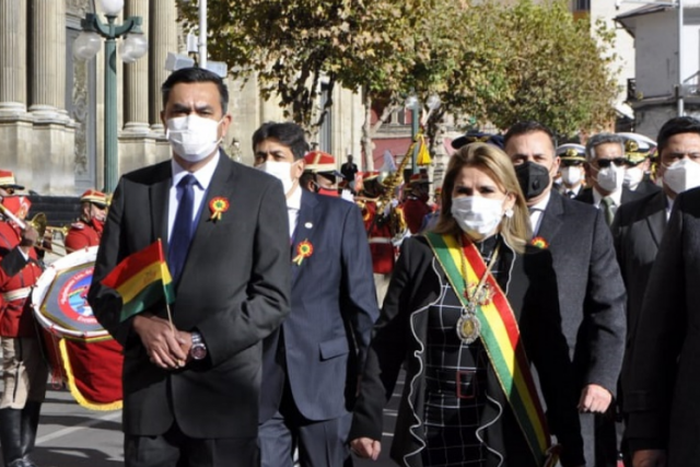 El momento central del acto protocolar fue cuando la presidenta Jeanine Áñez, acompañada por al menos 10 ministros, salió de Palacio Quemado para dejar las flores en homenaje a los libertadores.