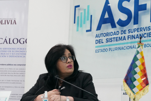La directora de la ASFI, Ivette Espinoza, en conferencia de prensa.