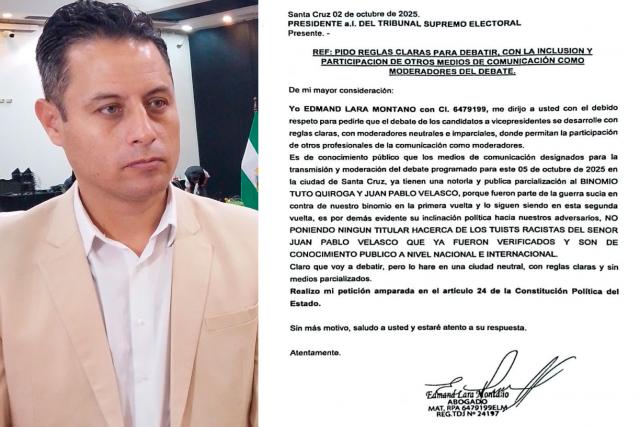 El candidato a la vicepresidencia por el Partido Demócrata Cristiano (PDC), Edmand Lara, oficializó, mediante una misiva enviada al Tribunal Supremo Electoral (TSE), sus condiciones para participar del debate convocado por el Órgano Electoral.