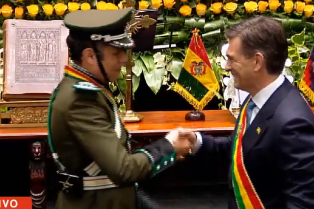 Acto seguido, se le coló la medalla y banda presidencial y recibió el fraterno abrazo de Edmand Lara, quien será su vicepresidente durante los próximos cinco años.