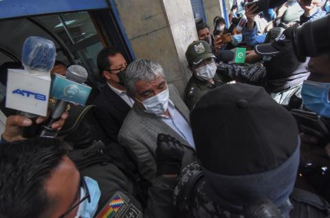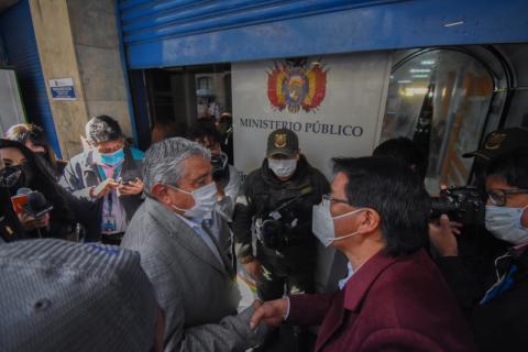 Arias asistió a la Fiscalía de La Paz para declarar en calidad de sindicado por el supuesto incumplimiento de una sentencia constitucional de 2016 que ordenaba la reincorporación de trabajo a tres exfuncionarios municipales.