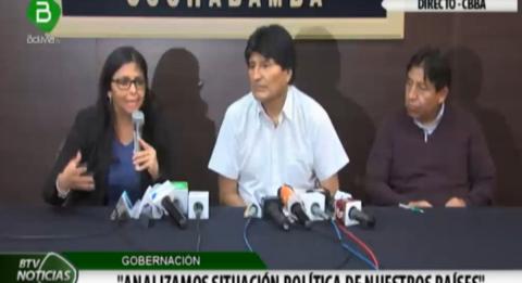 La canciller venezolana, Delcy Rodríguez, se reunió hoy con el presidente Evo Morales y el canciller David Choquehuanca. Morales expresó su apoyo al gobierno de Nicolás Maduro y dijo que se debe “defender las revoluciones democráticas en América Latina y el Caribe”.