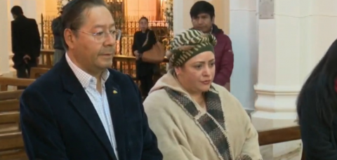 Acompañado de la ministra de la Presidencia, María Nela Prada, el mandatario de Estado llegó al velorio, en el templo Sagrado Corazón de Jesús, en la ciudad de La Paz, a alrededor de las 08:00.