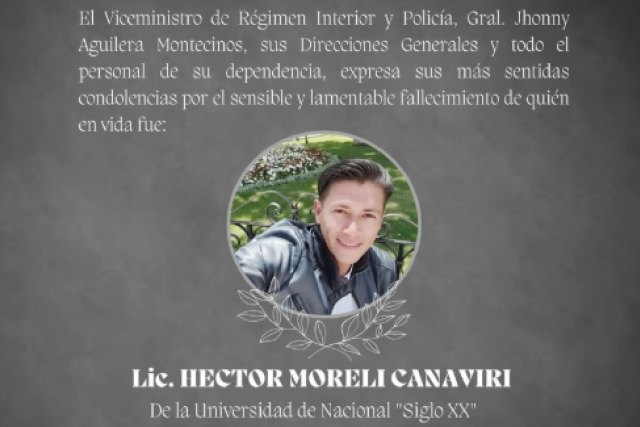 “Expresamos nuestras más sinceras condolencias y todo nuestro apoyo en ese difícil momento a toda la familia por el sensible fallecimiento de Héctor Moreli Canaviri, destacado dirigente universitario, cuyo legado de compromiso, lucha y liderazgo en defensa de los derechos estudiantiles y del bienestar de su pueblo perdurará en la memoria colectiva”, posteó el viceministro de Régimen Interior y Policía.