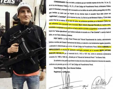 “Informamos al pueblo boliviano que la Sala Penal Primera del TDJ de Santa Cruz confirmó la sentencia condenatoria por 10 años por el delito de tráfico de sustancias controladas contra Mario Bascopé, uno de los cabecillas de la organización parapolicial y criminal RJC”, informó el ministro de Gobierno, Eduardo del Castillo.