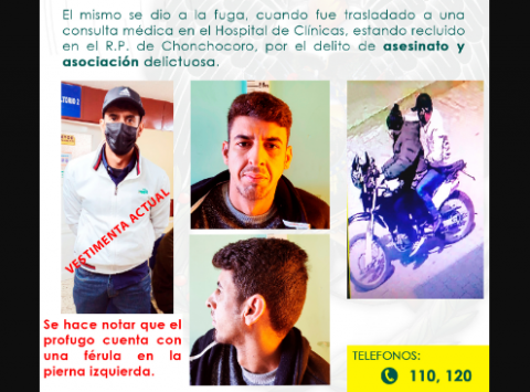 El pasado martes, el reo brasileño Felipe Edvaldo Menezez Iglesias (nombre apócrifo Andrés Luis Xavier da Rocha) se dio a la fuga aprovechando que fue autorizado a realizarse estudios médicos en el Hospital de Clínicas. En el hecho, dejó ocasionó la muerte del sargento primero Domingo Chávez Condori, por tres disparos en la cabeza, y dejó mal herido al policía Nelson Choque.